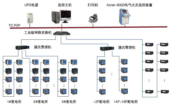 大型建筑群,樓層高,多棟樓體分散。采用Acrel-6000/Q電氣火災(zāi)監(jiān)控設(shè)備+Acrel6000/B電氣火災(zāi)監(jiān)控設(shè)備+電氣火災(zāi)監(jiān)控探測(cè)器三層結(jié)構(gòu)組網(wǎng)模式,便于區(qū)域化管理,采用RS-485網(wǎng)絡(luò)通信,以太網(wǎng)通信,滿足了通信實(shí)時(shí)性高的要求。